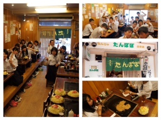 初めてもんじゃ焼きを食べる生徒も多いようです。お店の方に焼き方を教えていただきながら、クラスそろっての楽しい昼食となりました。