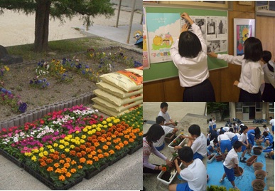 本日、専門委員会の活動を行いました。子どもたちは熱心に活動をしてくれています。写真は、環境美化委員が花の苗を植えているところと文化委員が掲示物を貼ってくれているところです。こうした子どもたちの力で、校内の環境が美しく整えられています。