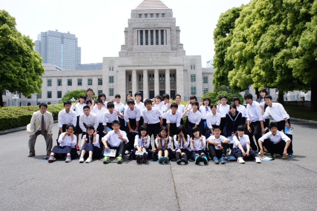 好天のもと、足取りも軽く、これからバスで国会議事堂に向かいます。