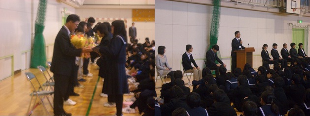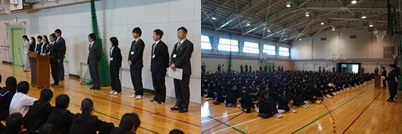 本日、表彰式を行い、部活動の大会、絵画や三泗教育発表振興会、図書委員会多読者の表彰を行いました。 その後、校長先生から、だんだんと挨拶ができるようになってきたと地域の方からの評価があり、今後も一層挨拶の輪を広げ、本校の伝統にしていってほしいとお話がありました。その際、公共広告機構の宣伝でも使われている、宮澤章二さんの詩を紹介しましたので、次に前文を掲載させてもらいます。 【行為の意味】 あなたの〈こころ〉はどんな形ですか と ひとに聞かれても答えようがない 自分にも他人にも〈こころ〉は見えない けれど ほんとうに見えないのであろうか