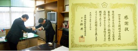 本日、全国納税貯蓄組合連合会の方が来校し、学校に感謝状をいただきました。感謝状は、毎年「税についての作文」に本校の多くの生徒が応募していることが、納税の啓発に役立ったということに対するものです。来年度以降も多くの生徒のみなさんの応募を期待しています。