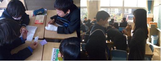 写真は2年生の英語の授業の様子です。グループで考えて、順にYEF(四日市英語指導員)のエイミー先生に話にいっています。みんな一所懸命考え話していました。