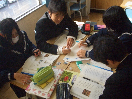 写真は3年生の国語の授業です。松尾芭蕉「おくのほそ道」平泉の段の読み取りをしています。古文を読み取りながら川や山、館などの位置関係をグループのみんなで頭を突き併せて考えています。