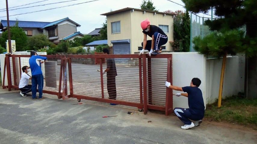今年は、教室のロッカー等の補修や正門の門扉の塗装などを行いました。(生徒の皆さんは、写真の気合の入った先生が誰か分かりますか?)