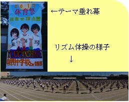 写真は、美術部製作によるテーマ垂れ幕と本校伝統の生徒全員による朝明中学校リズム体操の様子です。このリズム体操で子どもたちの基礎体力も培われています。