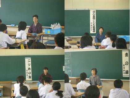 本日、朝の読書の時間を利用して、1年1組から4組で「民話語り」を行っていただきました。昔ながらの民話を雰囲気たっぷりに語っていただき、教室が『民話の世界』に包まれ気持ちの良いひと時を過ごしました。本のなかった時代、こうして語り伝えることが伝承の手段でもあったのですよね。