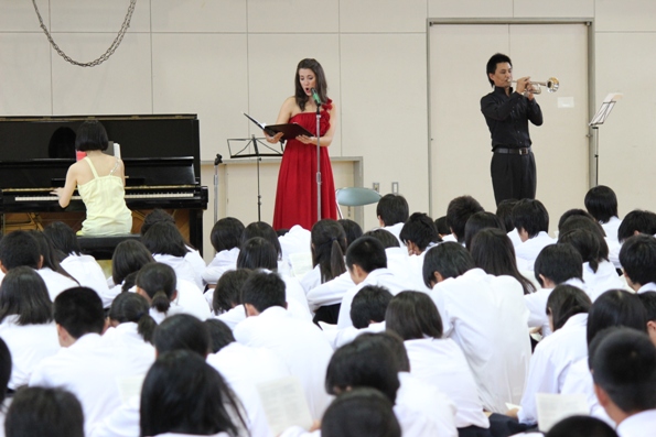 8日、音楽鑑賞会を開催しました。吉野綸子さん(ピアノ)とカナダの若手ソプラノ歌手ヤーナ・ミラーさんを演奏者としてお招きし、「アレルヤ」、「ドレミのうた」、「クスコスの郵便馬車」を演奏していただきました。また、「大きな古時計」は浅野先生(トランペット)も加わっての演奏も行ってもらい、その他英語の早口言葉や「翼をください」「旅立ちの日に」といった合唱も一緒に行いました。