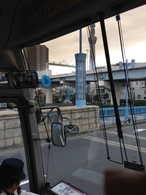 上野の分散学習を終え、月島もんじゃ街へ向かっています。移動の車窓からスカイツリーが見えました!