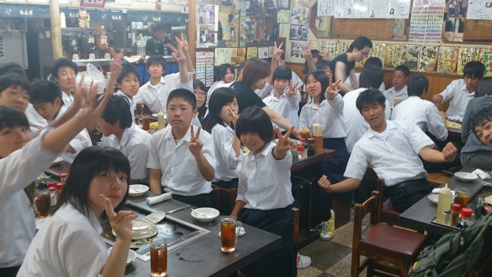 いよいよ最後の行程、月島もんじゃ街での昼食です。みんな疲れを顔に出すこともなく、笑顔でもんじゃ焼きをいただいてます。ここまで大きなトラブルや体調を崩す生徒もなくきました。後は新幹線で一眠り?する間に名古屋まで帰ってきます。