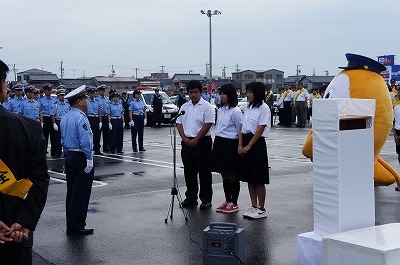 「秋の交通安全出陣式」に生徒会本部の生徒3名が参加してきました。