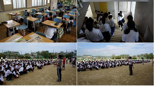 各クラスで担任の先生から避難ルートの説明を受けた後は、地震が来た時に実際に流される音声を使用しての訓練です。校庭に避難した後は校長先生からのお話がありました。