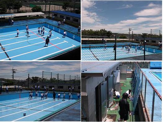 青い空、白い雲の下でみるみるきれいになっていくプールを見ていると、水泳の授業がとても楽しみになってきますね。1・2年生のみなさんも、掃除をしてくれた先輩に感謝しながら水泳の授業にのぞみましょう。