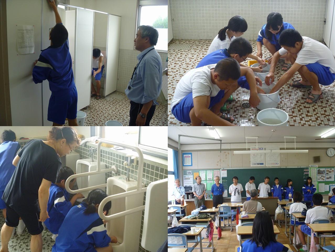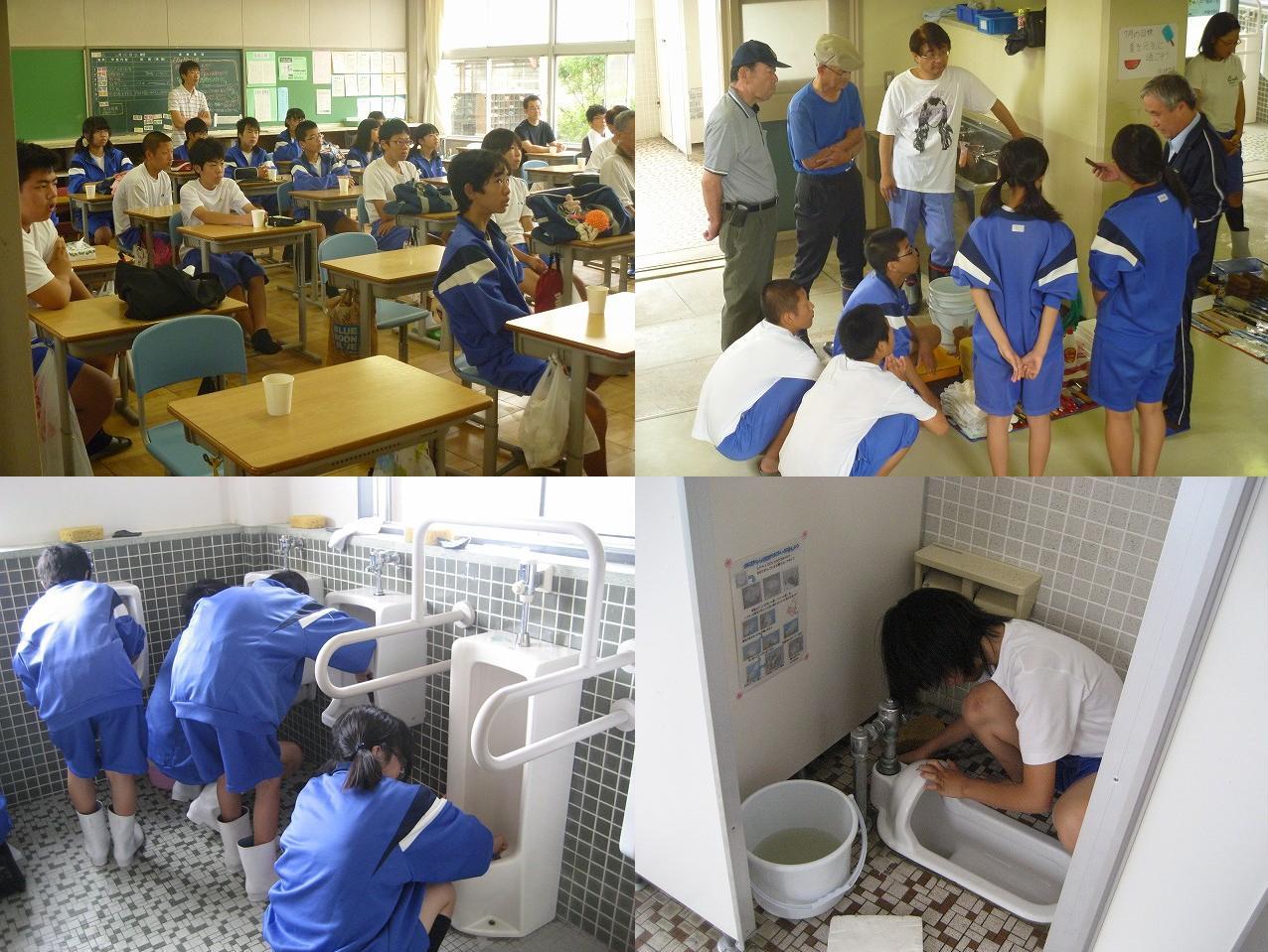 最初は臭いにおいやひどい汚れで、いい感じがしていなかったですが、やっているうちに、「なんとかこの便器をピカピカにしてやろう!」という気持ちになり、無言で集中して行っていました。掃除が終わったら教室に戻り、感想の交流です。生徒たちは自分がきれいにした便器を見て、とても満足感に浸っていました。「始めよりはきれいになったけど、まだ、もっときれいにできるはず!また、やりたい!」と言う生徒もいました。また、“三重掃除に学ぶ会”の方からは「本当に素直な生徒たち」「元気なあいさつができる」「一緒にやったら元気になれました」「トイレ掃除が終わった後の生徒たちの顔が輝いている」等のお言葉をいただきました。