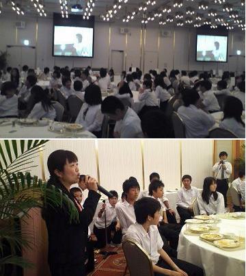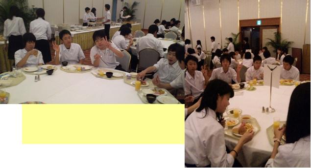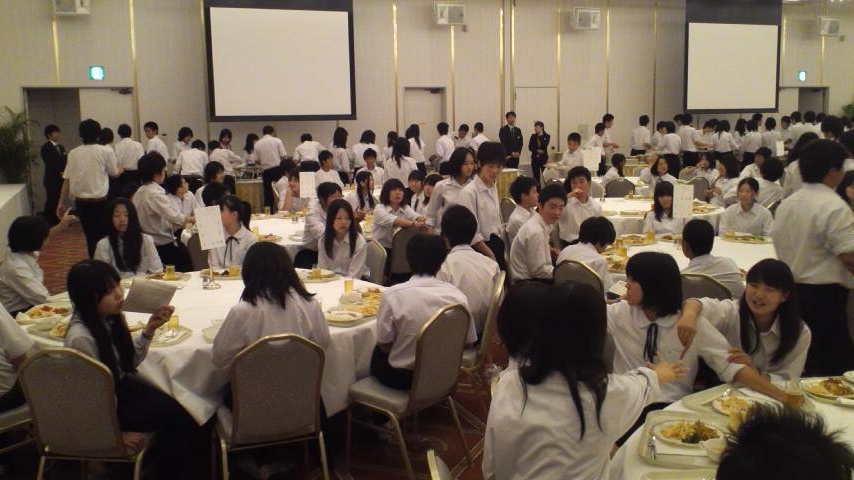 夕食会(学年親睦交流会)の開始前の様子です。バイキングで食事を各自で取ってきて、テーブルについています。くつろいだひとときです。