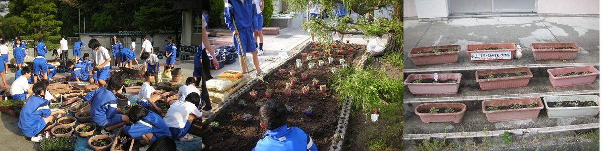 梅雨の時期でもあり天候が心配されましたが、昨日からの雨が朝の9時までにはあがり、119名の生徒と約50名の保護者や地域の方々が集まり、春の植栽を行いました。