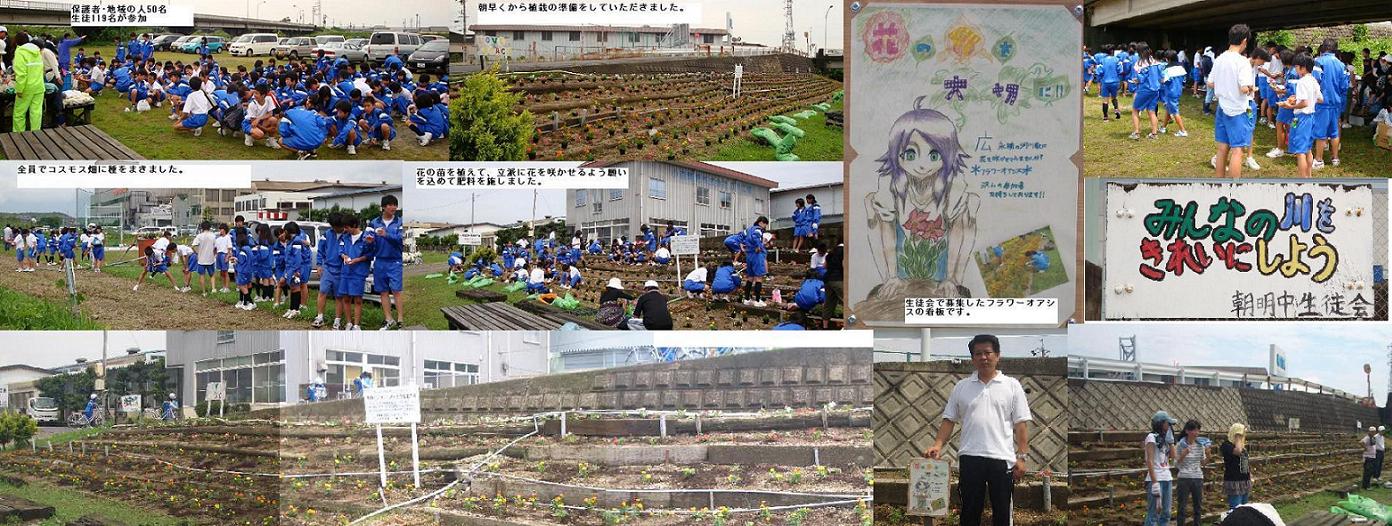 8時頃からPTAの方々に、植栽の準備や終わった後の焼きそばの準備をしていただき、9時過ぎに始まりました。まず、川沿いのコスモス畑にコスモスの種を蒔いて、それから、花の苗を植えました。肥料もたっぷり施したので、これから夏にかけて綺麗な花がたくさん咲くことでしょう。すごく楽しみです。
