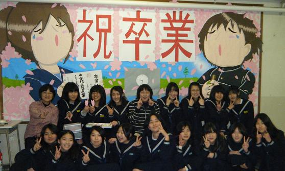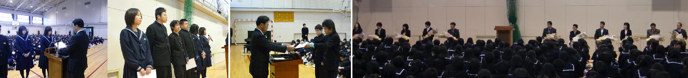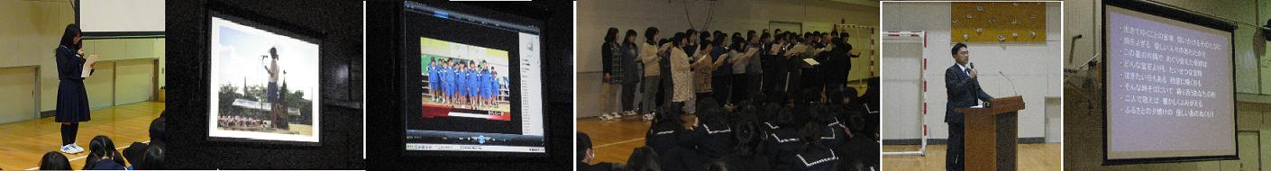 生徒会役員からあいさつがあり、3年間の思い出を綴った「スライドショー」、部活の後輩からの心のこもった「ビデオレター」、そしてサプライズで、指揮:伊藤、伴奏:松尾、歌:教職員により「エール」を合唱しました。この合唱は、全員そろっての練習時間があまり取れない中、通勤途中の車の中でCDをかけるなどして練習してきたもので、うまくはなかったかもしれませんが、一生懸命心を込めて歌いました。(歌の中にいるとうまいのかどうか分かりませんでした。)