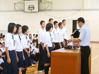 2学期は一番長い学期で,行事も多い学期です。始業式の中で校長先生がお話された「目標を持って頑張れば望みは叶う」の言葉どおり,しっかりと自分の目標をもち学習や行事,部活動に取り組んでいきましょう。始業式後には,夏の中体連の表彰が多数行われ,その様子の写真です。 |