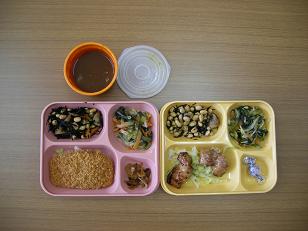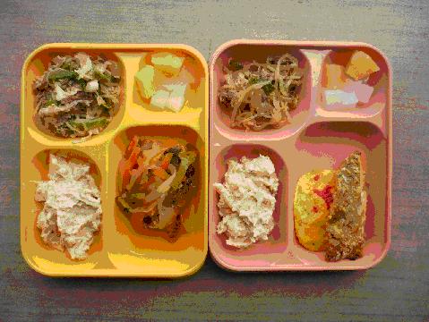 Aたらの西京焼き Bかれいの甘酢あんかけ、豚肉のオイスターと根菜サラダです。魚の日でしたが、18日よりは多く注文がありAたらの方が多かったです。Aは薄味の西京味噌ですごく食べやすく、Bのかれいは骨がなくABともに野菜が多くおいしくいただきました。また、ナタデココは歯ごたえがありました。 |