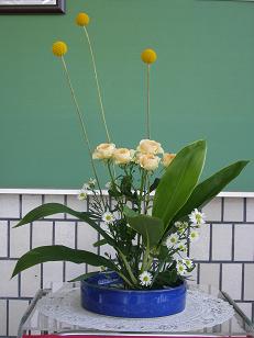 本日玄関の生け花を替えていただきました。ありがとうございました。花はバラを中心に、ゴールドスティック、クジャクソウ、アオドラセナです。その中で、ゴールドスティックは細くて堅い茎の先に黄色い小さな花が球状についていて、かわいらしい感じがします。花言葉は、心の扉を叩くということです。 |