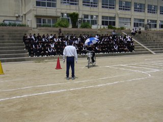 三交ドライビングスクールの方々のご指導のもと,交通事故に巻き込まれる原因や傘差し運転などの危険な運転を実際に体験することが出来ました。今後自転車などを運転する時は,今日のことを忘れずに安全に加害者・被害者にならないよう気をつけて欲しいと思います。 |