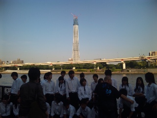 浅草の仲見世でお土産を買ったり雰囲気を味わったあと、隅田公園から見えるスカイタワーをバックに記念撮影をしました。今から日出桟橋へ移動し、ディナークルーズです。 |