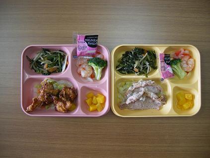 5月6日の連休明けから家庭訪問を4日間行っていた関係上、本当に久しぶりの給食となりました。本日のメニューは、A「鶏肉の唐揚げ 900Kcal」、B「豚ロースのスパイシー焼き」、他のおかずは同じで、野菜炒め、ほうれん草のごま和え、えびとブロッコリーのサラダ、フルーツでした。