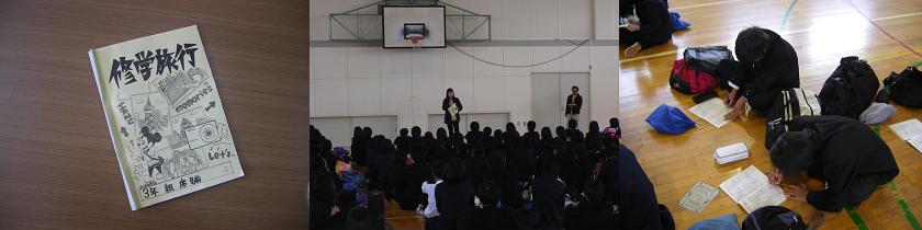 待ちに待った3年生の修学旅行が、来週17日(月)から19日(水)の2泊3日の予定で実施されます。行き先は東京・横浜方面です。今日はその最終確認を兼ねた事前指導を体育館で行いました。145名全員が元気に当日参加できることや病気・けがなく羽津中学校へ戻ってこられるように願っています。