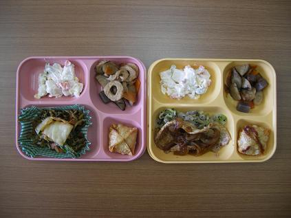 今日のメニューは、A「キムチビビンバ 817Kcal」、Bは四日市名物となりました「トンテキ 878Kcal」が登場しました。その他のおかずは、ごまキャベツ、ポテトサラダ、筑前煮、えびの包み揚げでした。注文はやはりBの四日市風とんてきが多く、子どもたちにも人気のようです。