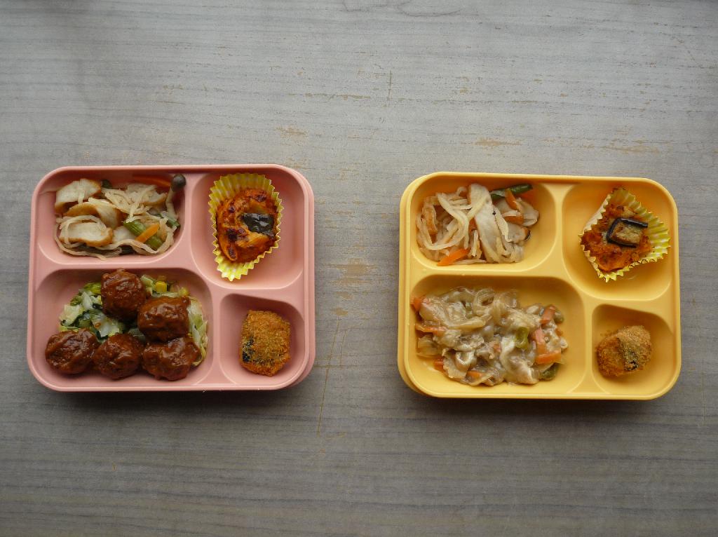 今日のメニューは,A「デミグラスソース肉団子 798Kcal」,B「チンジャオロウスー780Kcal」でした。その他のおかずは,ナスのトマトソースグラタン,南瓜フライ,そのほか,Aほうれん草のソテー,B切干大根煮でした。今日もおいしくいただきました。今日のカロリーはどちらも800Kcal以下とやや低い目でしたね。 |