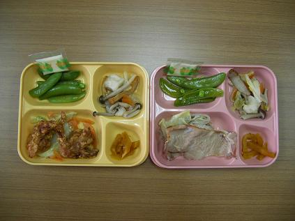 今日のメニューは、A「豚肉の生姜焼き 876Kcal」、B「鶏肉の唐揚げ 876Kcal」でした。他のおかずは、野菜炒め、スナックえんどう、白菜炊き、たくあんでした。今日は、肉メニューだからでしょうか?昨日よりは注文数は増えました。1年生は約4割の生徒が注文しています。 |