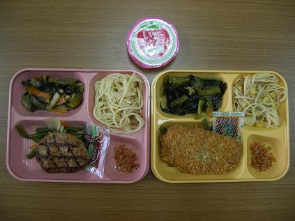 今日のメニューは、A「ハンバーグ 842Kcal」、B「とんかつ 815Kcal」でした。その他のおかずは、いんげんソテー、小松菜の煮浸し、ツナスパゲティ、あみえび佃煮、そしてデザートにいちごミルクプリンでした。今日もおいしくいただきました。とんかつよりもハンバーグの方が、カロリーが高いのに少々驚きました。 |