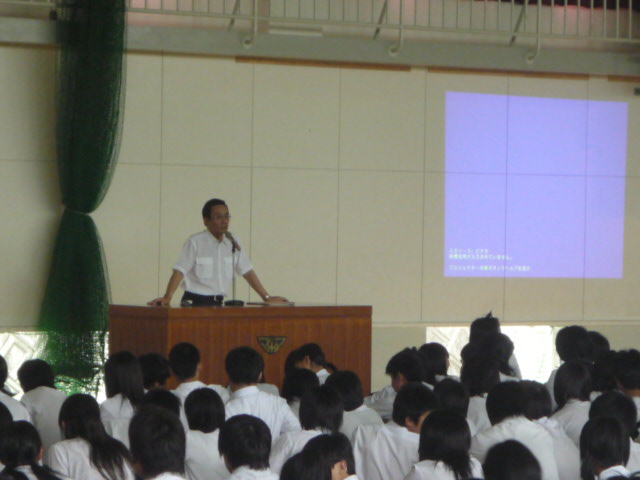 教育委員会の青少年育成指導室から横井さんに来ていただき、お話をしていただきました。100円おにぎりの万引きで20万円の罰金の話から始まり、VTRを交え、なぜ万引きがいけないのかを中心にお話がありました。生徒たちも真剣にお話を聞いていました。 |