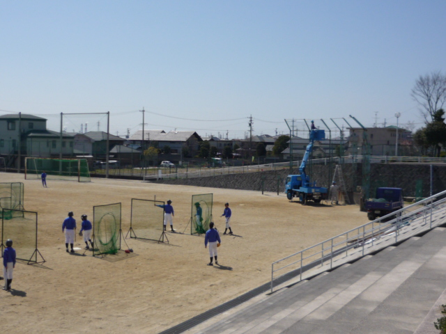 今日は風もなくたいへん暖かくて春本番を思わせる日になりました。グランドでは野球部とソフト部が練習しています。野球部の横ではバックネットの補修が始まりました。ずいぶんと古くなって穴がたくさん開いていましたので,直してもらうことでこれからは安全に練習をすることができます。自然と練習にも熱が入ります。 |