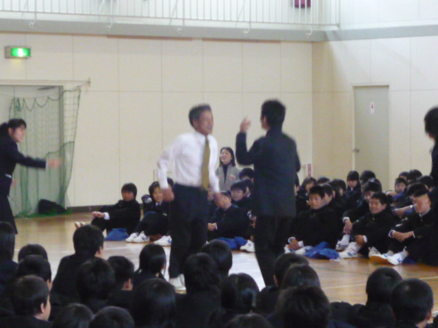 生徒会主催で行われる対面式では、あいさつに続き「先生ドッキリなわとび自己紹介」(写真は校長先生)というアトラクションもあり、和やかな雰囲気で進められました。 |