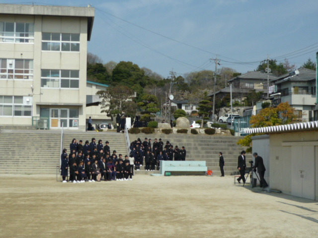 晴天の中、各クラスの学級写真を撮影しました。「太陽がまぶしい!」と言う生徒もたくさんいました。出来上がりが楽しみですね。 |