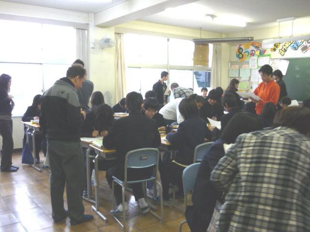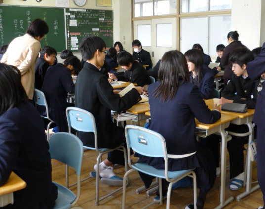 3年生の国語は森鴎外著「高瀬舟」を学習しています。今日は「主人公の喜助が取った行動を認めるか」「喜助の立場だったらどうするか」「喜助に対する『遠島』という裁きを認めるか」という課題に対し,グループで互いの意見を出し合って話し合うという内容でした。この時間は公開授業でしたが,あらかじめ自分の考えをまとめてあるので,グループの話し合いもスムーズに進みます。 |