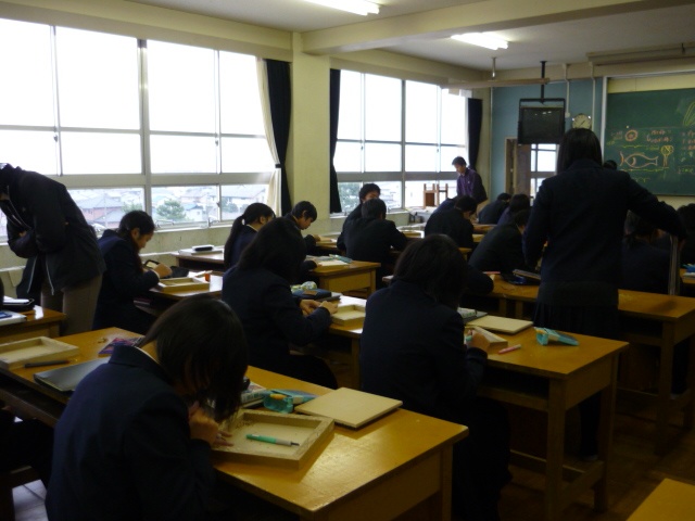 3年生の美術の時間では,以前に製作したワイヤーアートを入れる木彫りの額縁を作っています。各自が自分の好きなデザインや日付などを入れて彫刻刀で彫っています。週に1時間の美術の時間であり,今週末からは高校入試が始まりますので,授業ができない時もあります。完成まであと何時間と時間を気にしながらの製作ですが,きっと思い出の作品に仕上がることでしょう。 |