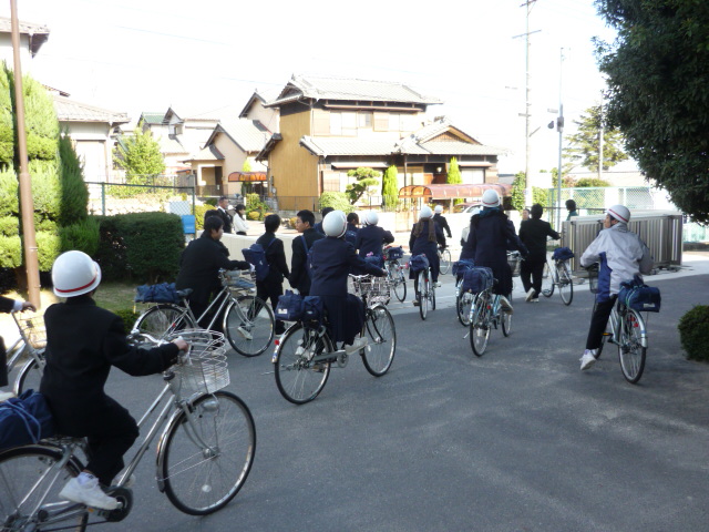 今週からテスト期間が始まりました。加えて今日は羽津中学校区の幼小中の教職員が羽津北小学校に集まって授業参観と事後研修会がありますので,全校一斉の下校となりました。校門を出るとほとんどの生徒がまっすぐ駅に向かって降りていきます。自転車の生徒も徒歩の生徒も一緒なので,交通事故が心配です。交通ルールの遵守については粘り強く指導していかなければなりません。 |