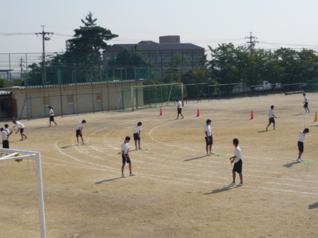 3年生の選択体育の2学期の種目はゴルフです。ボールはプラスチックやゴム製で本物ではありません。ゴルフクラブは他校からの借り物ではありますが本物です。はじめてクラブを手にして戸惑い気味の生徒もいますが,ちょっぴり大人になった気分で楽しそうに取り組んでいました。 |
