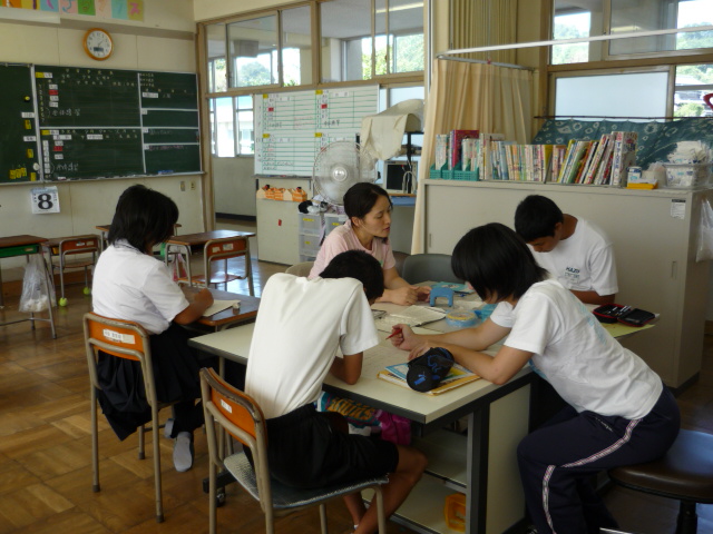 5限目の6・7組の数学の授業です。3人がそれぞれ自分の課題に対してプリントを使って学習を進めていました。8月の終わりはとても涼しく過ごしやすかったのですが,昨日今日はとても暑く,じっとしていても汗ばむ気温で教室の扇風機もフル稼働ですが,どの生徒も集中して課題に向かっていました。 |