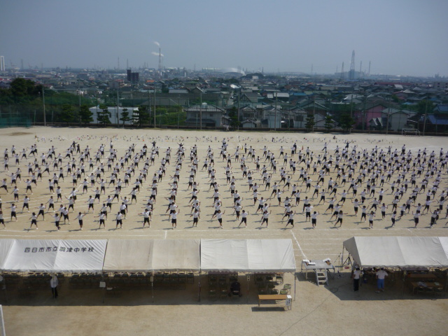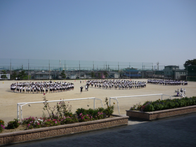 体育祭を明後日に控えて,全校での練習が始まりました。写真は全校ダンスのオクラホマ・ミクサーです。学年ごとに円を作って踊ります。このフォークダンスは男女が手をつないで踊るので,恥ずかしそうな生徒もいるようです。この後に披露する創作ダンスはノリのいい曲で元気いっぱいに踊ります。当日のできばえをご覧ください。 |