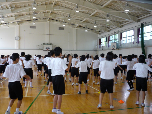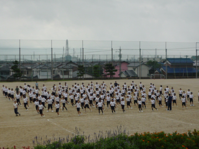 天候が気になる毎日ですが,本日より学年練習がはじまりました。写真は1限目の2年生のダンス練習です。夏休み中や1日の講習会に参加した生徒がたくさんいたため,1時間の練習でほとんど全員が踊れるようになりました。汗が吹き出てくる蒸し暑さの中でしたが,音楽に合わせて楽しそうに踊っていました。 |