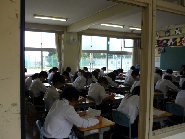 夏休みが終わって2日目の今日は実力テストです。朝から雨がザーザー降って,教室は蒸し風呂のように蒸し暑いですが,5限の最後まで集中を切らさずに取り組んでいました。特に3年生はこの2学期が自分の進路に向かっての勝負どころであり,夏休みの成果が表れるとあって,どの生徒も真剣な表情で問題に取り組んでいました。 |