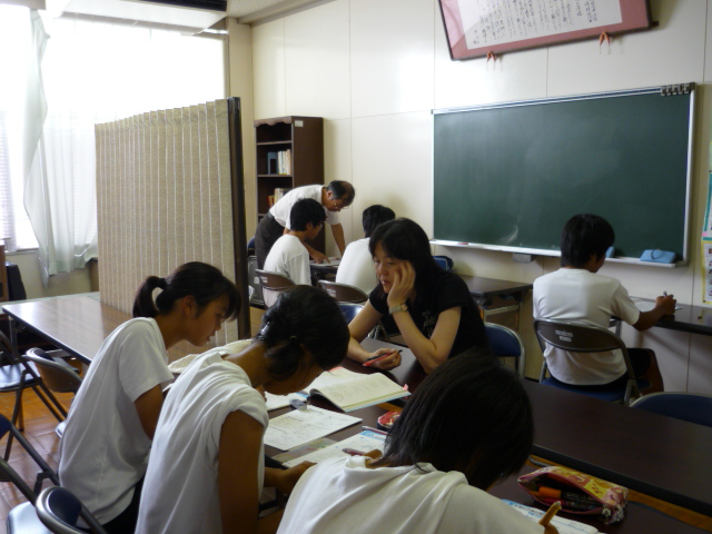 今日は3年生と1年生の質問日です。相談室には朝から3年生が夏休みの宿題などを持ってきて,担当教科の先生に質問しながら熱心に学習しています。隣の保健室でも1年生が他の教室から机を持ち込んで学習しています。学習するために自主的に登校してきていますので,せめてエアコンの効いた部屋で学習をさせてやりたいという学年の配慮です。涼しい部屋で学習もはかどることでしょう。 |