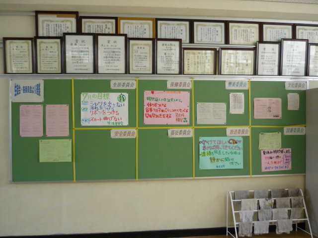 以前にも紹介した生徒会用掲示板です。7月の専門委員会が終わってから、全校生徒に呼びかけるポスターや掲示物がたくさん掲示されています。規律ある学校生活を送るためには、教師の呼びかけだけでなく、生徒会による自主的な活動が不可欠です。活発な生徒会活動で今学期を終えることができることはすてきなことです。 |