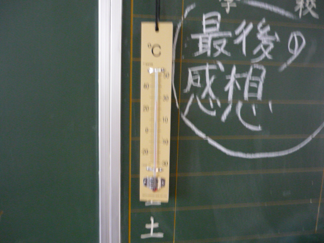 写真ではわかりにくいと思いますが,気温27℃をさしています。現在18:30ですので,生徒はみんな帰宅して誰もいない教室でもこの気温です。朝日の当たるこの教室では,40名近くの生徒全員が揃った午前中の室温はきっと35℃近く(あるいはそれ以上)だったに違いありません。この気温ではせっかくの扇風機も熱い空気をかき混ぜているような感じでした。夏休みまであと2日です。 |