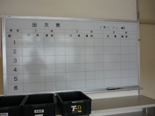 職員室前の出欠表です。毎朝の学活で各学級の保健委員が健康状態とともに調べて記入します。月曜日の今日は、いつもより体調不良による欠席者が多かったようです。先週末から急に暑くなったうえに、中体連に向けて土日とも練習や試合の部活が多かったためでしょうか。けがをしている生徒もちらほら見られます。早く体調を戻して夏休み前の2週間を乗り切りたいものです。 |