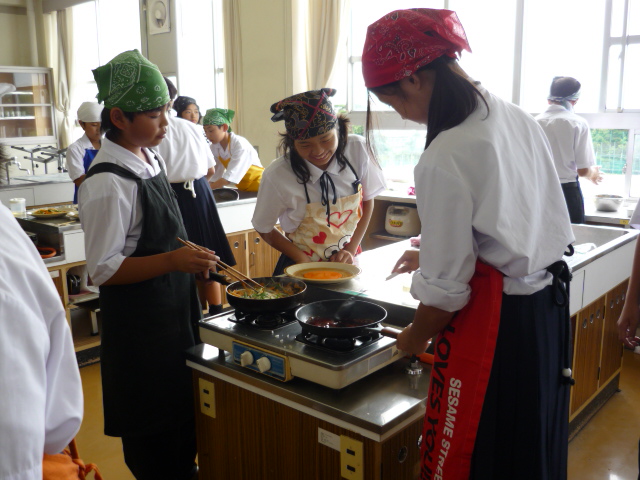 今日の1年生の調理実習はハンバーグです。前回の卵焼きからくらべると、ずい分本格的な料理になりました。つけ合せの野菜炒めやハンバーグにかけるソースも同時に調理します。それぞれが仕事を分担して、協力してテキパキと働いていました。職員室にもハンバーグを焼くいい匂いがただよってきます。 |