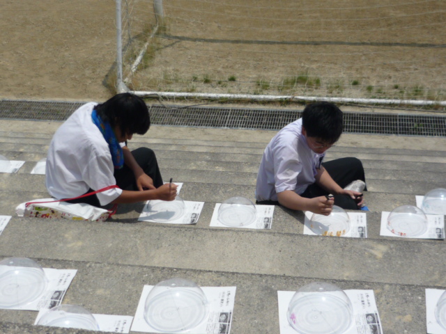 3年生の理科の学習です。梅雨の晴れ間になった今日1日,グランドの階段上に置いた各自の透明半球に,太陽の高度を記していきます。夏の暑い今頃と冬至の頃に実際に自分で印をつけて,その違いを実感しようとするものです。朝の始業前から放課後まで休み時間ごとにやってきて印をつける作業は暑くて大変ですが,夏の太陽に照らされてきっとうまく結果が出ることでしょう。 |